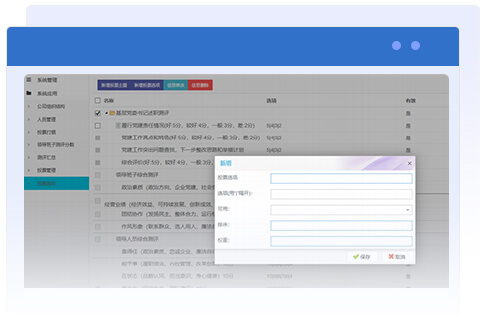 綜合測評系統(tǒng)為領(lǐng)導(dǎo)人員、中層干部、一般人員的綜合考核測評提供服務(wù),支持電腦、手機(jī)在線打分。支持自定義打分投票主題、投票項(xiàng)組合、投票二維碼自動生成等,自定義測評單位、對象、權(quán)重、對應(yīng)關(guān)系等。實(shí)現(xiàn)掃描一張二維碼完成所有測評內(nèi)容,測評報(bào)表一次成型、實(shí)時(shí)更新。支持在一場會議中,同時(shí)有多個(gè)不同的投票需求,可以將多個(gè)投票打捆,生成一個(gè)二維碼,用戶掃碼一個(gè)二維碼,即可進(jìn)行多個(gè)投票的打分操作,以免造成二維碼數(shù)量過多,造成混亂。